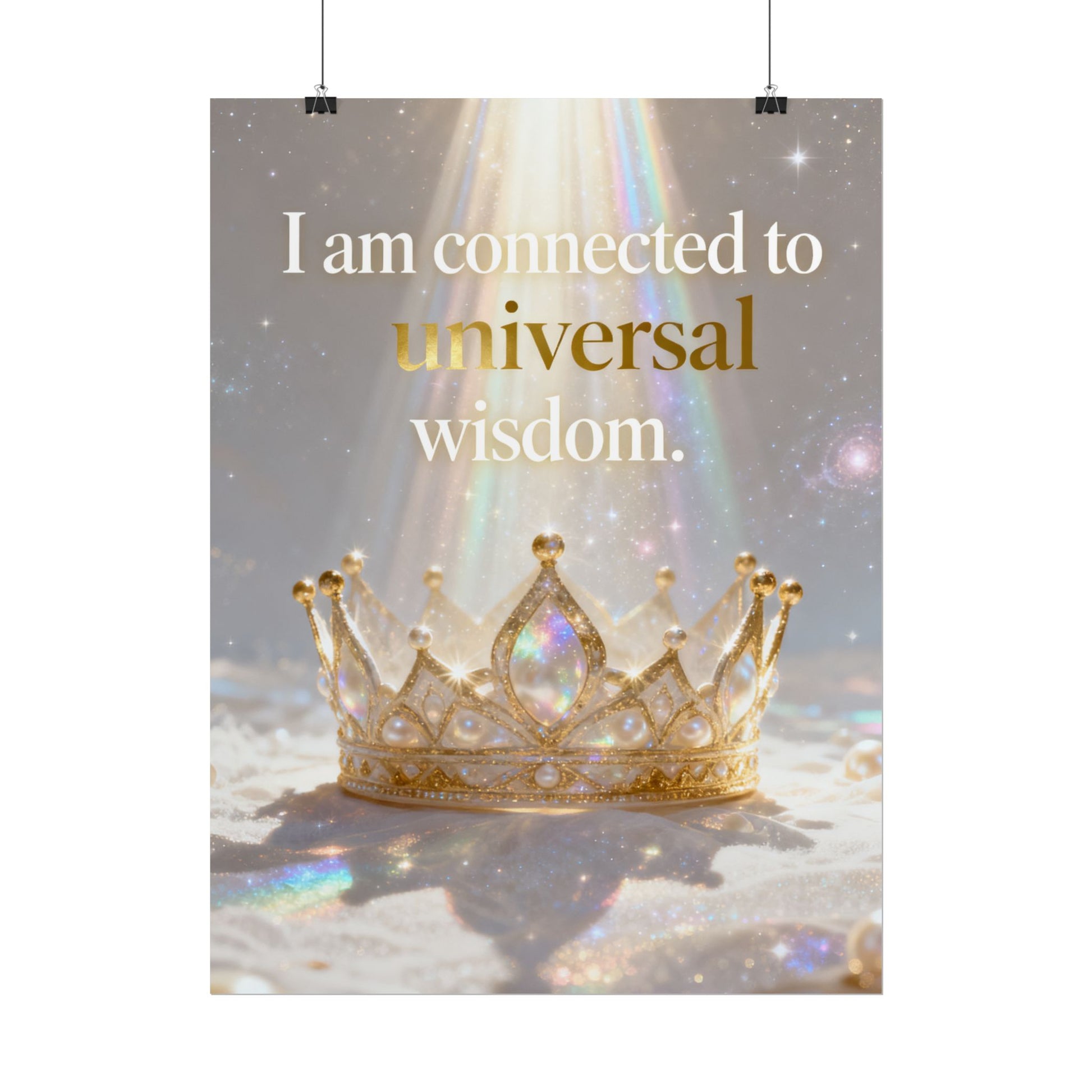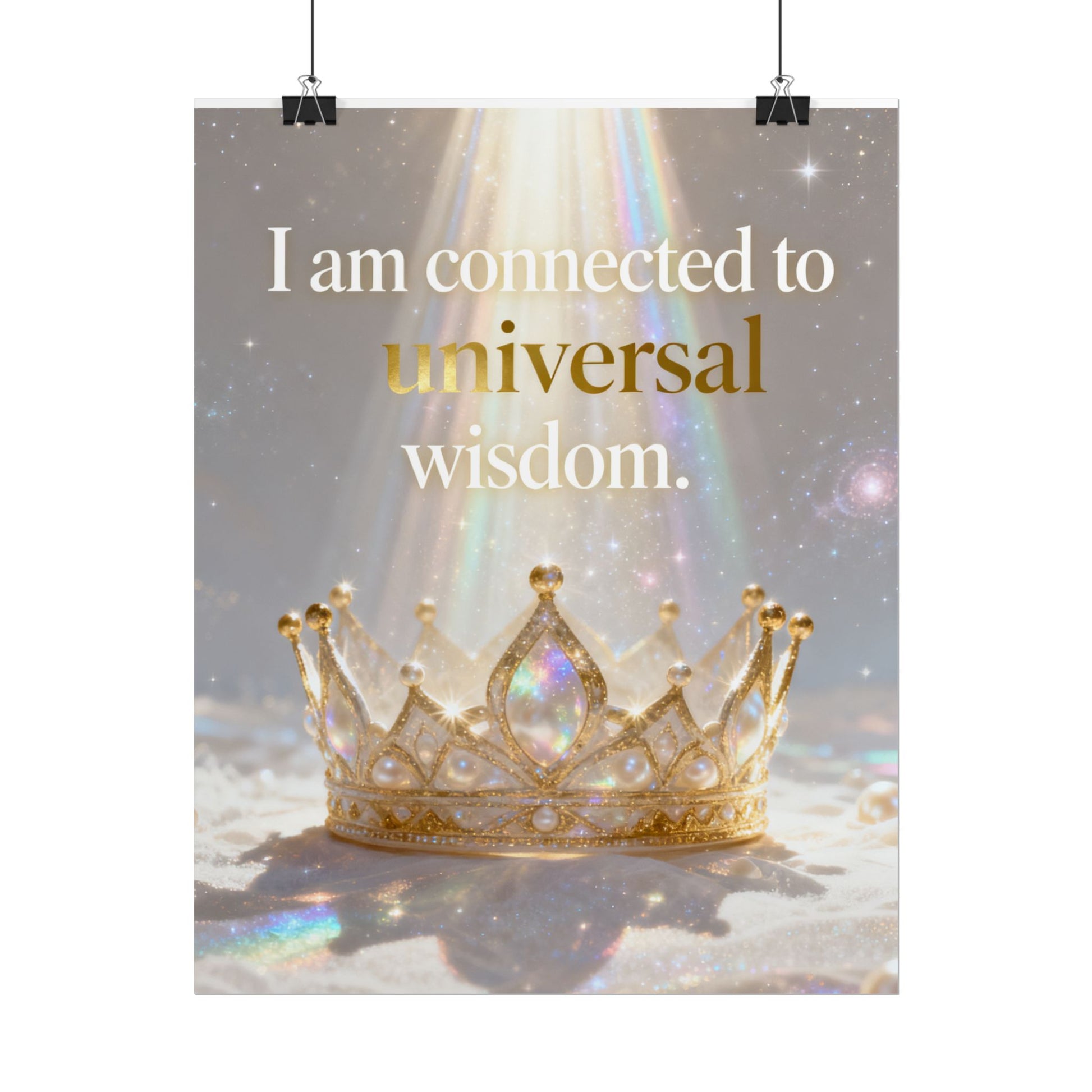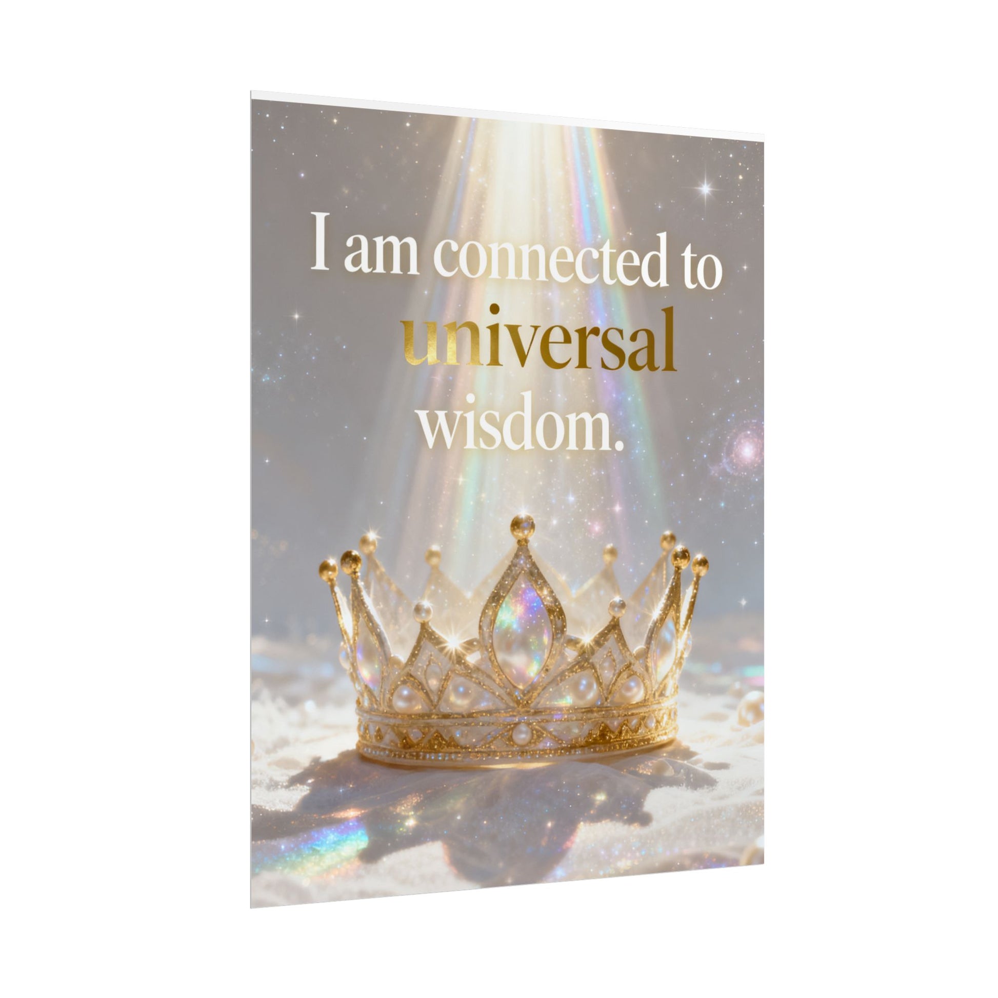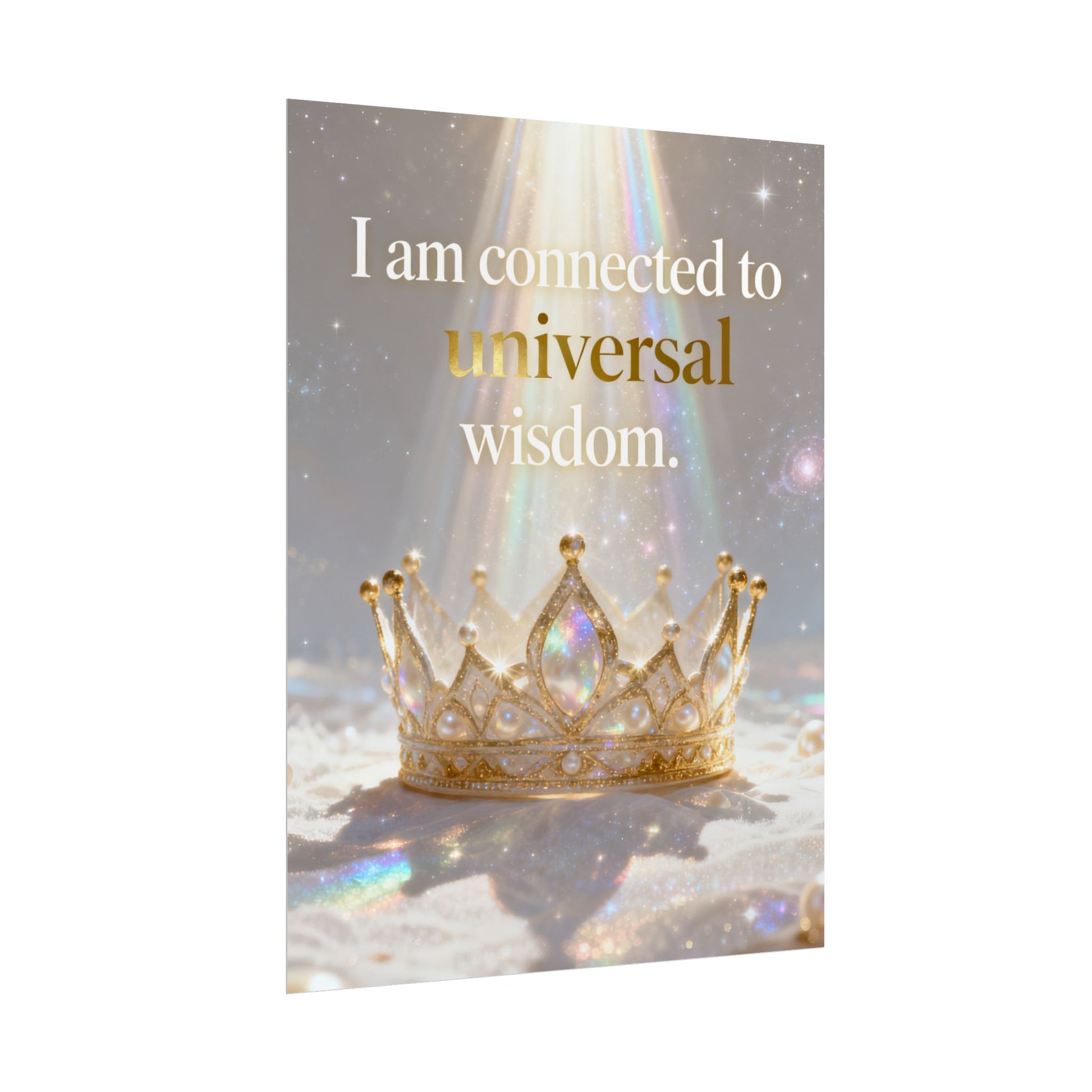 A serene affirmation poster that blends soft iridescence with regal imagery. The print features a luminous crown bathed in prism-like light with the uplifting phrase “I am connected to universal wisdom.” It brings gentle, contemplative energy to a meditation nook, bedside wall, or studio — a visual cue to pause, breathe, and reconnect. Choose from three paper finishes to suit your space: textured fine art for a painterly, archival look; semi-glossy for crisp, vivid color; or matte for a subtle, low-reflective presence. Available in multiple sizes and orientations so it fits small shelves or gallery walls alike.