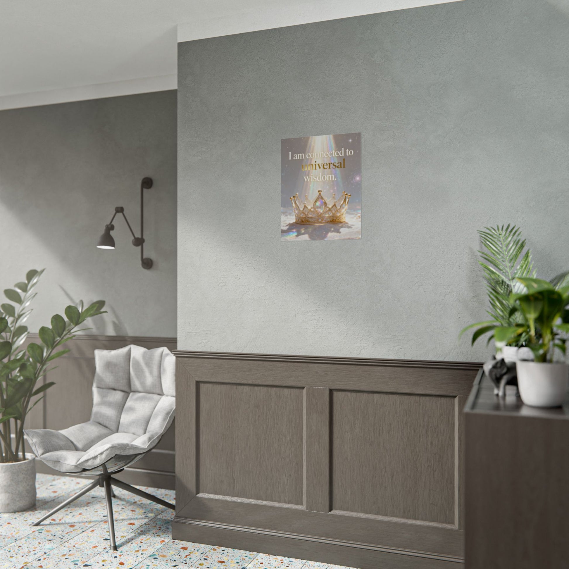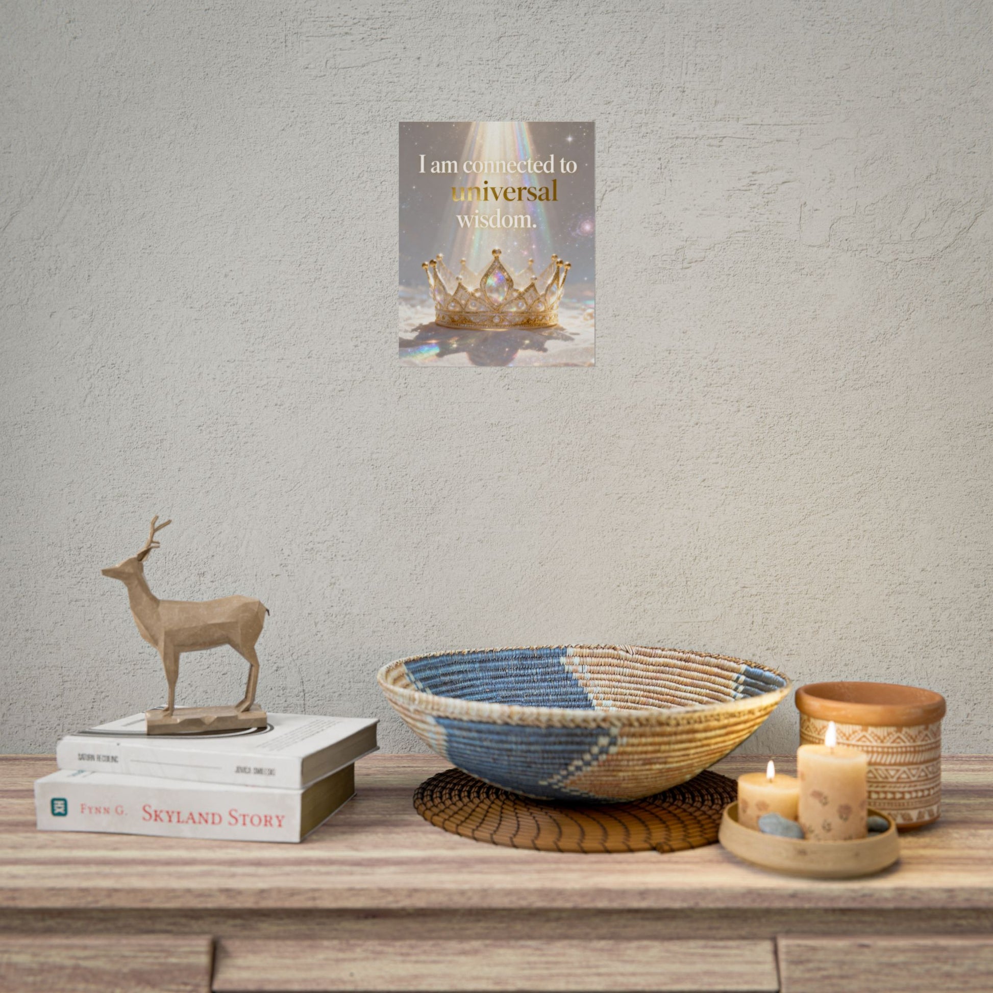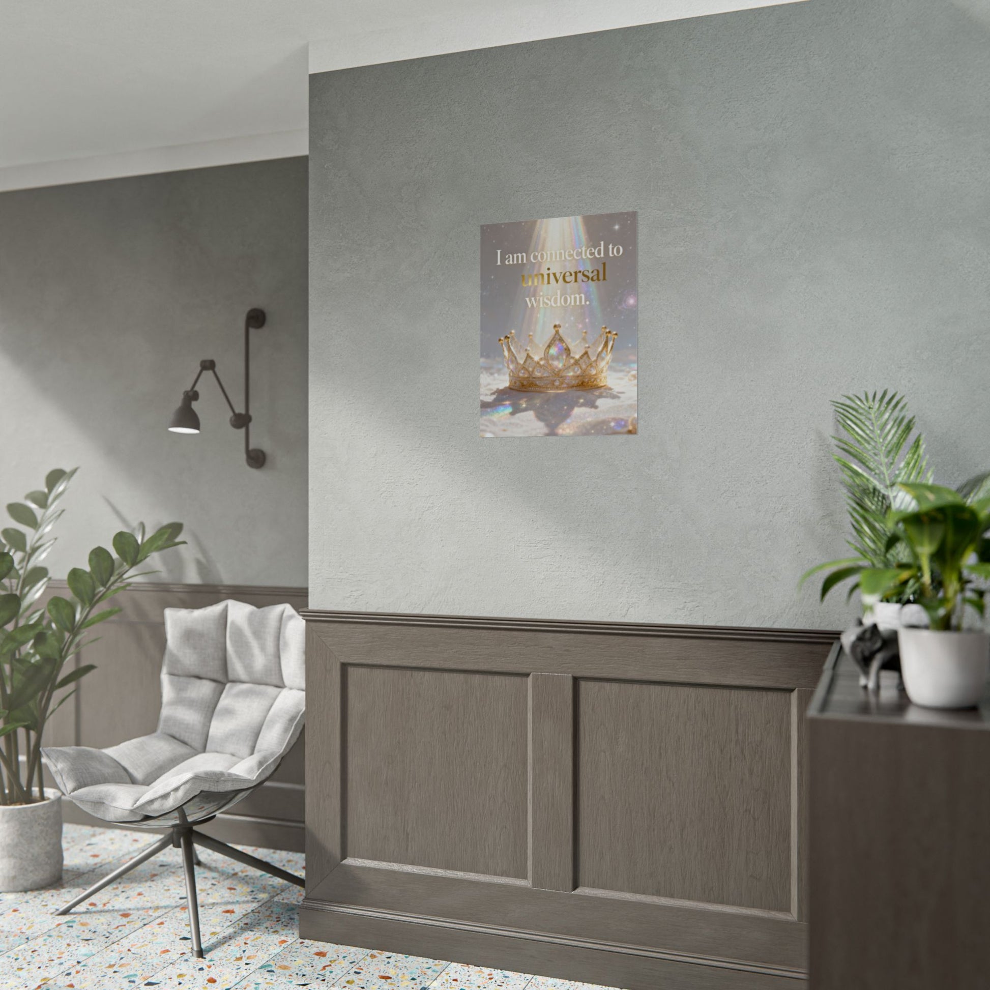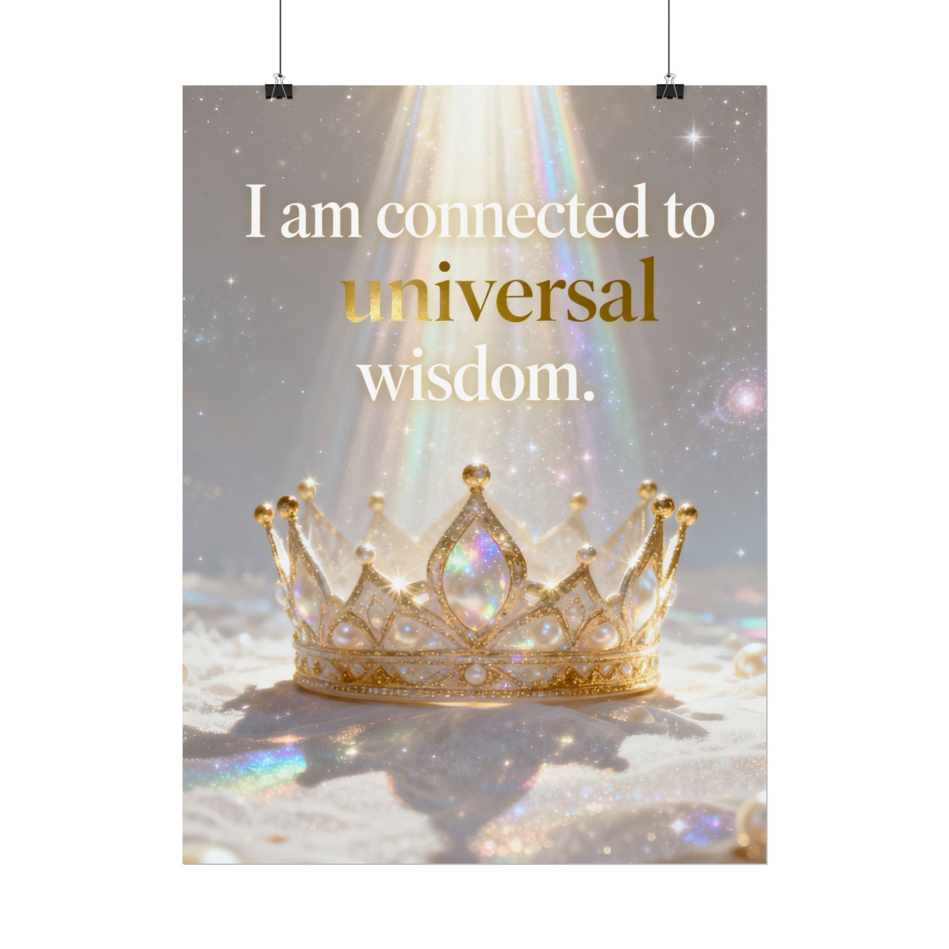 A serene affirmation poster that blends soft iridescence with regal imagery. The print features a luminous crown bathed in prism-like light with the uplifting phrase “I am connected to universal wisdom.” It brings gentle, contemplative energy to a meditation nook, bedside wall, or studio — a visual cue to pause, breathe, and reconnect. Choose from three paper finishes to suit your space: textured fine art for a painterly, archival look; semi-glossy for crisp, vivid color; or matte for a subtle, low-reflective presence. Available in multiple sizes and orientations so it fits small shelves or gallery walls alike.